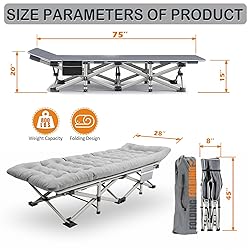 Ultra-Fast Setup Camping Cot – Effortless in Seconds: Experience lightning - quick assembly with our upgraded folding cot, ready for use in under 10 seconds. Lightweight and compact, it requires no tools or complex setup. The reinforced structure provides robust support, accommodating users up to 600 lbs, making it suitable for all body types, perfect for on - the - go adventurers. Detachable Comfort Mattress Pad – Adaptable for All Climates: Comes with a high - quality, removable soft mattress pad that offers enhanced comfort. Keep warm during chilly nights and remove it on hot days to enjoy breathable air circulation, ensuring a pleasant sleep experience in any weather. Heavy - Duty Double - Layer Fabric – Durable & Easy Maintenance: Constructed with 1200D double - layer Oxford fabric, this camping cot guarantees superior strength, water resistance, and effortless cleaning. A simple wipe with a damp cloth restores its freshness. The innovative design positions the crossbar beneath the fabric for a smooth, bar - free lying surface. Sturdy Steel Frame Construction – Built for Long - Term Use: Engineered with a heavy - duty square steel tube frame and 10 robust tubular iron legs, the cot delivers exceptional stability and reliable support up to 600 lbs. It provides a secure and stable resting place for a single adult, ensuring peace of mind during every use. Versatile All - in - One Cot – Ideal for Any Occasion: Whether you're camping, hiking, hunting, on a road trip, or just relaxing at home or the office, this cot is your perfect companion. It's great for poolside lounging, lakeside relaxation, patio use, or as an extra guest bed. With its compact foldable size (41"x9"x7") and lightweight design (14.7 pounds), it's easy to transport and store, maximizing convenience wherever you go.