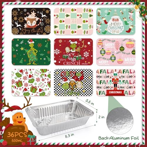 - 【Sufficient Quantity】 Receive a pack of 36 Christmas-themed foil pans and 36 festive cardboard lids, perfect for holiday gatherings. Each foil container measures 8.3” L x 5.5” W x 2.0” H, providing ample room for delicious treats.