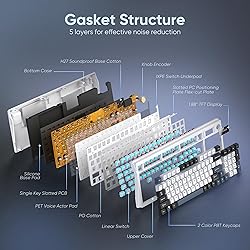 【1.14" TFT Screen & CNC Knob】It's time to pick the most stylish keyboard for you. The K95 gasket keyboard is surely your top choice. 1.14" TFT screen homepage can display various information you need. Not only you can adjust the time by downloading the K95 US Setup software, but also you can adjust volume, RGB light mode, language, and screen image/Gif by rotating or pressing the CNC knob(Note: Adjust time for Windows: Click on the K95 software in wired mode. Adjust time for Mac: bit.ly/MacK95Time). 【Triple Mode Multi Device】It can not only get rid of the cord shackles for a fast typing experience, but also meet the extreme speed experience of wired mode when charging. With the flip of 2 switches on the top, you can seamlessly switch between different devices in WINDOWS, MacOS, 2.4G wireless, wired and BT modes, giving you the freedom to move between different spaces. (Note: FN+Q/W/E to switch between BT1 /BT2/BT3 device). 【Gasket Keyboard】Gasket keyboard truly shines with its distinctive construction and superior performance in mechanical keyboards. Compared to Top-Mount Design, the Gasket Design has five-layer shock absorption and a one-key positioning plate. The unique design allows for a more even keystroke feel on the keyboard and enables full-key anti-ghosting. This results in a softer and more comfortable typing experience. It will be ideal for gamers and typists alike. 【Hot Swappable Switches】The hot-swappable keyboard is a game-changer! Built-in hot-swap PCB lets you replace 3-pin or 5-pin switches without soldering, giving you a wide choice. Built-in pre-lubricated pink shafts make typing smooth and comfort. Comes with spare pre-lubricated shafts and a key puller for you to experiment with different switches freely to find the perfect feel for your typing style or gaming needs. 【Full RGB & 8000mAh Battery】 1.68 million RGB colors and rechargeable 8000mAh battery light up diverse atmospheres. Use FN combination, knob & screen, or software to set RGB light mode (like rhythm lights), color, speed, and brightness. FN + TAB can adjust 8 side lighting modes. South-facing LEDs meet most keycaps lighting requirements, including side-engraved. The powerful battery ensures continuous usage, lasting about 48 hours with backlight and about 266 hours without backlight(Opt for the original charging cable or a qualified data - capable one). 【Programmable Software】Programmable mechanical keyboard allows for deep customization of keyboard functions. Downloading the K95-US driver (only settable in 2.4G wireless or wired mode on WINDOWS) enables comprehensive programmability, key mapping, macro definition and adjust key sensitivity, sleep time, debounce, screen Gif image and backlight effects (including music rhythm backlight) to suit any workflow, gaming or life scenarios. 【Ergonomic 90% Layout & PBT Keyboard】The 90% compact layout keyboard saves more space over full-size, keeps arrow keys, number keys, and some function keys for gaming and work. Dual-color PBT keycaps are richer in color without fading, and stepped keycaps ensure that long typing times are more comfortable and less fatigued. Two-stage foot support adapts to multiple angles. Suits intense gaming or different work with efficient, user-friendly design.