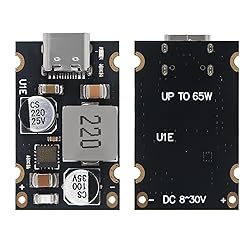 - Product temperature rise and output ripple:Test conditions: Input voltage 24V, ambient temperature 24 ℃, load of a laptop computer that supports PD65W (with approximately 50% battery capacity), and the computer undergoes pressure testing to ensure that the power terminal power reaches 65W.Parameters:Input voltage: DC 8-30VOutput voltage: Automatically adjust between 3.3V and 21V when connected to a compatible TYPE-C receiving device (input voltage should be higher than output voltage, and if 20V fast charging is triggered, input voltage should be higher than 20V)Output power: maximum 65w (5V3A, 9V3A, 12V3A, 20V3.25A, etc.)Maximum output: 20V 3.25AConversion efficiency: 92%~97%Output voltage ripple:<200mVNo-load current:<3mAInput overvoltage and undervoltage protectionInput overcurrent protectionOutput overcurrent short circuit protectionOverall over temperature protectionSupported charging protocols: PD3.1 (PPS), QC3.0, SCPPackage: 3PCS PD 65W Fast Charging Module Type-C Interface