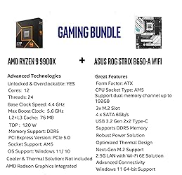 AMD Ryzen 9 9900X Desktop Processor, 12-Core, 24-Thread, 5.6 GHz Max Boost, Unlocked for overclocking, L2+L3 76 MB cache, DDR5, Default TDP 120W. The world's best gaming desktop processor that can deliver ultra-fast 100+ FPS performance in the world's most popular games For the state-of-the-art Socket AM5 platform, can support PCIe 5.0 on select 600 Series motherboards. OS Support: Windows 11/ 10-64-Bit Edition. Cooler & Thermal Solution (PIB) not included. AMD Radeon Graphics Integrated ASUS ROG Strix B650-A Gaming WiFi Motherboard, ATX Form Factor, Support Dual Channel Memory DDR5 up to 192GB, 3 x M.2 slots and 4 x SATA 6Gb/s ports, Wi-Fi 6E, Bluetooth v5.2, USB 3.2 Gen 2x2 Type C, USB 3.2 Gen 2 Type C & Type A, Windows 11 64-bit Support AMD Socket AM5(LGA 1718): Ready for AMD Ryzen 7000 Series desktop processors.Audio : High quality 120 dB SNR stereo playback output and 113 dB SNR recording input;/ Robust Power Solution: 12 + 2 power stages with 8+4 pin ProCool power connectors, high-quality alloy chokes, and durable capacitors to support multi-core processors Optimized Thermal Design: Massive VRM heatsinks with strategically cut airflow channels and high conductivity thermal pads;/ Next-Gen M.2 Support: One PCIe 5.0 M.2 slot and two PCIe 4.0 M.2 slots, all with heatsinks to maximize performance;/ Advanced Connectivity: One USB 3.2 Gen 2x2 Type-C and eight additional rear USB ports, USB 3.2 Gen 2 Type-C front-panel connector, HDMI 2.1, DisplayPort 1.4, and one PCIe 4.0 x16 SafeSlot