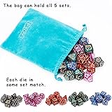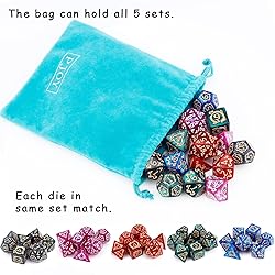 5 sets Complete DND Dice Set with Dice Bag. 35pcs in total with a large dice bag Patterned Well Balanced DND Dice: The dice set is with delicated patterns and made with precision mold to ensure great balance Easy reading font and color combo. Pretty dnd dice with neat look Made of high quality acrylic, sturdy enough for years to come. Hand picked to ensure quality Great DND Gifts: Ideal for Dungeons and Dragons and many other ttrpgs Christmas gifts for gamers