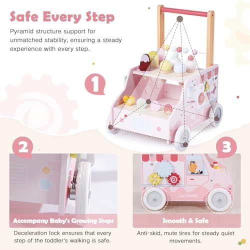 - Multi-function In 1 BABY WALKER: Our ice cream handcart walker is a veritable dessert shop.Panel features small bear sales stand,ice cream and candy rotary gear,colorful beads, and geometrical activities.Let babies can push this ice cream walker around,encourage babies' balance coordination and learn to stand on their own.Pink dreamy atmosphere for baby girl experience the whimsy of an ice cream shop assistant and fun dessert time!