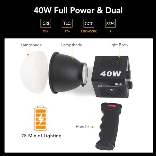 - 【Built-in 3400mAh High-capacity Battery】M60 40W COB video light offers two power supply options: DC power adapter or direct use of the built-in battery. With a built-in 3400mAh high-capacity battery, it can be used continuously for up to 5 hours for minimum brightness, and the maximum brightness can be used for 75 minutes. Supports charging while in use.with Type C Port can Charge the phone.