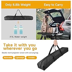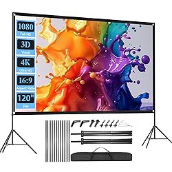 - Descriptions:Experience cinematic excellence with the SCREENMAX 120 inch Foldable Projector Screen. This wrinkle-free movie screen with 16:9 format and wide 160° viewing angle. The polyester milk silk material ensures crystal-clear images, making every movie night a truly immersive experience.Take the theater-like experience outdoors with this portable projector screen. only 8.8lb weight, portable projector screen conveniently fits in the included carry bag, Whether it's a backyard gathering or a camping trip, you can create a captivating movie experience anywhere.The resistant and stable tripod provides excellent support, thanks to the stable threaded connection system, making outdoor projector screen perfect for outdoor use. It comes with grounding nails, ropes, and a sandbag to enhance stability and prevent it from being knocked down by the wind. Setting up this projection screen is quick just 10 miniute, no tools required, with instructions. The detachable pipes and tripod are visually appealing and resistant. You can easily transport the screen for projector to any location .When not in use, the it can be easily folded for storage and transportation.Product Parameters:Size: 120 inches (diagonal length)length * height: (110inch * 80inch)Ratio: 16:9Screen Material: 150g polyesterPipes Material: aluminum alloyWeight: 4kgPacking List:1*120 inch projector screen, 2* tripods, 4* pipes, 2*5m ropes, 6* ground nails, 1* carry bag and instructions(If you find that the product you received is missing accessories or the item is damaged, please contact us and we will send or replace it to you in time.)Professional Customer Support: SCREENMAX professional customer support will solve any problems you may encounter during installation process. If you have any questions, please contact us and we will get back to you within 48 hours!