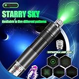 [Good Quality & Long Distance] This flashlight is made of aluminum alloy, very strong and durable, good quality, and it has a non-slip design, long distance range. [Rechargeable Design] Equipped with a large-capacity rechargeable battery, it can be used for up to 8 hours on a single charge. [Starlight Pattern] Equipped with 5 starlight caps Press the star cap and rotate to remove the star cap, then you can see the green light beam in the dark, and you can see different starlight patterns when the star cap is installed. [Multi-scene use] You can use it in a variety of situations, such as construction sites, outdoor adventures, classrooms, conference presentations and other interesting uses. [Notice] Do not use the light directly at human's or animal's eyes, and keep it away from children. The laser pointer output Power ≤0.39mW, Class 1 laser. It is within the safe range and does no harm to humans and animals