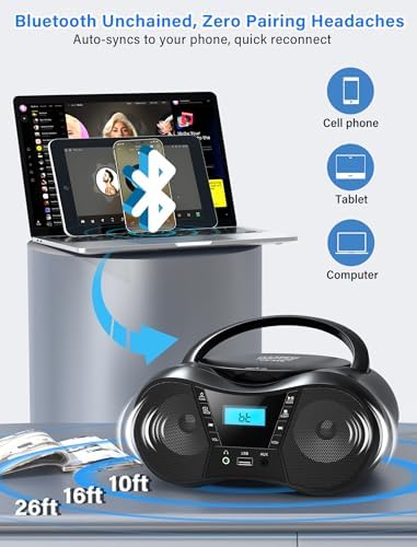 - 【Lossless Bluetooth & Effortless Connectivity】With Bluetooth 5.1 technology, our boom box portable cd players for home easily connects to cell phones, tablets, and computers to deliver a well-balanced sound with minimal distortion. The bluetooth CD boombox has a range of up to 26 feet for convenient connectivity
