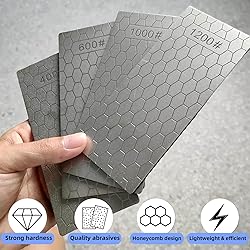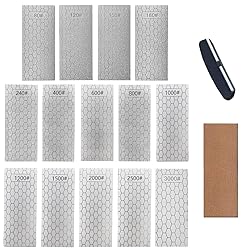 【Package Contents】The package includes 14 different sizes of diamond pieces + angle guide + leather strop. Diamond sharpening stone including (80+120+150+180+240+400+600+800+1000+1200+1500+2000+2500+3000 Grit) 【Product Size】Length 150mm/5.9 inch, Width 63mm/2.48 inch 【Unique Honeycomb Design and Non-slip base】The sharpening stone set with unique honeycomb design ensures that the dust generated during the grinding process will not affect the sharpening. The diamond sharpening stone has a non-slip base to ensure that it will not slip during use and e asily tackle both coarse and fine sharpening jobs. 【Use for most cutting tools and cutter knife edges】Widely used for grinding of household knives, professional chef knives, outdoor knives, engraving knives and other knives.More efficiency and durability are less risky than waterstones damage margins. not need water during the sharpening process 【Service Guarantee】If you have any questions or concerns about the use of the product, please contact us and we will reply to you as soon as possible