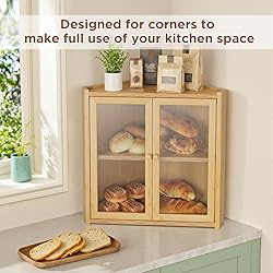 - 【Corner-Smart Design】 Maximize kitchen space with our corner bread box, engineered to snugly fit into 90° wall angles. Its ergonomic shape transforms unused counter corners into a functional storage hub, freeing up valuable workspace while keeping bread and baked goods within easy reach. 【Layered Capacity & Versatility】 Though compact, this bread box features dual-tiered storage to hold 2-3 large loaves, rolls, or muffins. The inner tray organizes items neatly, and its versatile design accommodates fruits, spices, or kitchen utensils—perfect for decluttering countertops.