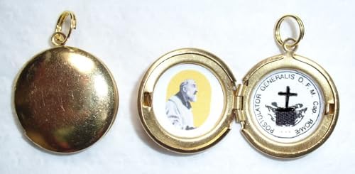 Saint Padre Pio polished solid brass relic locket with a fragment of cloth relic. The metal locket measures approximately 3/4" or 20mm, which is about the size of a American nickel. The fragment of cloth relic was touched to the Saint by the Capuchins in Italy (authentic 3rd class relic). The ring-loop at the top is double-looped, making it very secure. This locket is individually handmade--the contents in this locket are put together with devotion, and each locket is unique and special--in other words this locket is NOT mass produced. A free St Padre Pio holy prayer card (as shown in the pics) is included with each locket.