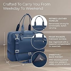 - Your ideal weekender bag is here—designed with soft leather handles (plus a shoulder strap for versatility), a spacious compartment for your clothes and laptop, and airport-friendly features like a SpeedThru™ pocket and a slip-through back panel to slide over luggage handle.