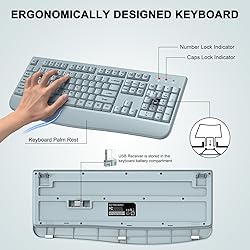 Wireless Keyboard and Mouse Combo, ULSOU 2.4G Full-Sized Ergonomic Computer Keyboard with Wrist Rest and 3 Level DPI Adjustable Wireless Mouse for Windows, Mac OS Desktop/Laptop/PC(Grey)