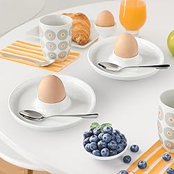 More than a regular sized ceramic egg holder, this breakfast serving tray, in addition to the center for eggs,diameter 5.5 inches, has a wider area around it to serve breakfast.With the cute egg shape this dish makes a fantastic centerpiece for your table.Comes with a corresponding number of stainless steel spoons for dining. Its glazed interior is nonporous, so foods won't interact which is safe for use in the microwave, dishwasher, freezer, and oven - up to 500 degrees Fahrenheit. Space Saving Design: The egg holder cup plates have a stackable design for easy organization and do not take up much space when cleaning or storing. Neat &Stable:The hard-boiled egg holder has a stable base to hold eggs securely in place, and the grooves around the edge can also be used to collect eggshells, protect eggs and keep the table neat and tidy. Supplies for both household and commercial use, and perfect for any other catered events, wedding receptions, and other upscale occasions.