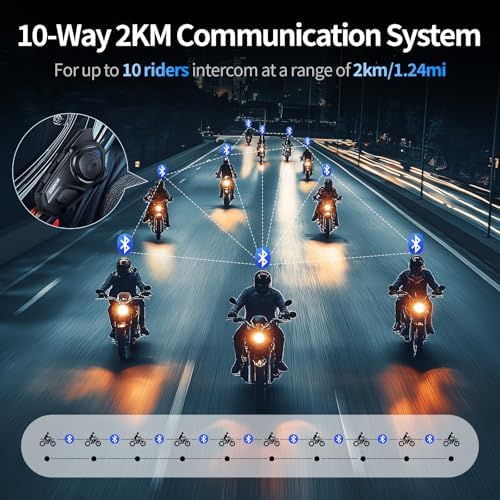 - 10-Way 2KM Live Intercom: Stay connected with up to 10 riders using this advanced motorcycle communication system, boasting an impressive 2KM (1.24 miles) range. Designed for seamless group rides, this helmet intercom is cross-brand compatible with popular models like CarXX and SeXX, ensuring reliable and uninterrupted communication on every journey