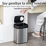【Touch-free Motion Sensor Lid Clouser】 Open the lid by simply waving your hand in front of the motion sensor, so you can throw things away with no contact. 【Long-Lasting Battery Life (Patented Technology)】 Our trash can leverages patented technology to significantly extend battery usage up to 6-9 months, reducing the need for replacements. Requires 3pc C and 2 pc AA batteries (not included). 【Fit any space】This sleek and modern set features a 13 Gal (50L) and 3 Gal (12L) capacity, perfect for kitchen, Bathroom, offices, or any room in your home, office, schools. 【Ease and Convenient】Removable ring liner holds trash bag sturdy in place and prevents bag from overhanging for a neat and clean appearance. Use any standard trash bags or NINESTARS custom trash bags NSTB-13-30 and NSTB-3-30. 【Durable Materials】 Water-resistant and finger-print resistant stainless steel base helps keep the can clean. This trash can will look great in your kitchen while saving you the hassle of manually opening and closing the lid.
