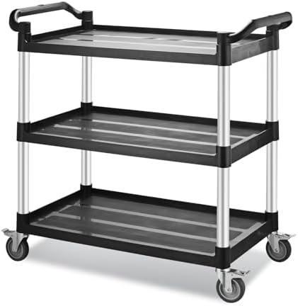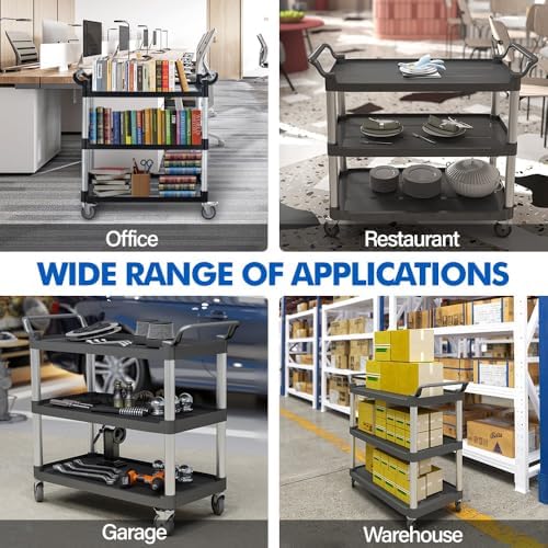 Utility Rolling Carts with Wheels, Large Size Plastic Service Carts, Heavy Duty Restaurant Cart with 4 Lockable Brake Wheels for Kitchen/Office/Warehouse (3 Tier - 34×17×37inches / 510lbs)