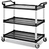 - 3 Tier Heavy Duty Utility Rolling Cart - Size: 34" long, 17" wide, 37" high (including handles). This large size plastic utility service cart on wheels features three spacious shelves, providing ample space for catering equipment, hotel linens, maintenance tools and more