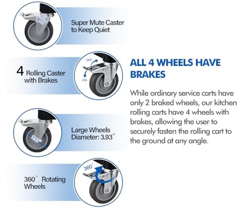 - 4 Lockable Wheels - This utility plastic service cart is equipped with 4 silent-rolling wheels capable of 360 degree rotation, each with brakes, allowing you to stop it steadily at any angle and prevent the heavy duty utility cart on wheels from slipping away