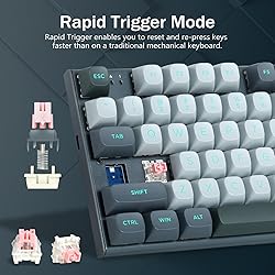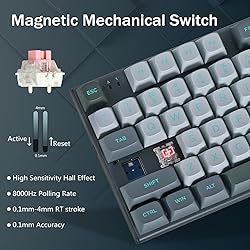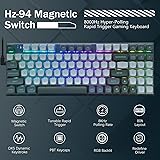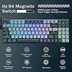 Adjustable Hall Effect Magnetic Switches ── The entire keyboard is equipped with fully adjustable switches, enabling you to set every key's actuation point from a light 0.1mm to a strong 4mm in 0.1mm steps, putting you in control for fast keypresses or ultra-accurate typing. Rapid Trigger and Dynamic Keystrokes ── The magnetic switch keyboard features rapid trigger capabilities, allowing the quick activation and deactivation of keys with minimal physical movement, enabling quicker key resets and faster-repeated inputs. The rapid trigger keyboard has Fast Key Reset, Dynamic Keystrokes, Adjustable Actuation Points, and Dual-Action Keys functions, ensuring minimal latency, and providing a competitive advantage in fast-paced games. Customizable Actuation Points ── The custom keyboard offers an adjustable actuation range from 0.1 to 4.0 mm, providing 40 levels of per-key actuation. Set keys for light, ultra-fast movements or deeper presses to avoid accidental triggers. Whether you need light, ultra-fast movements or deeper presses, this thocky keyboard design provides precise control tailored to your playstyle, particularly beneficial in fast-paced games like FPS and RTS games. Hyper-Processing Technology ── Enables premier HZ-94 performance, processing and transmitting inputs up to 8x faster than conventional gaming keyboards with 8,000Hz hyper-polling. *8,000Hz hyper-polling is dependent on CPU; older CPUs may experience reduced performance. Pro Software Customizable ── Expand your options using the driver to design your own new modes and effects. Macros with different keybindings or shortcuts for more efficient work and gaming. Settinng different switch travel distance to match different use scenes. How to change a different profile:need to click Download button after you choose a different profile. Software link: bit.ly/HZ-94Driver Vibrant RGB ── Up to 20 presets backlighting modes are free to choose by the keyboard itself or by the software. Brightness and backlight flowing speed is also adjustable on keyboard. Select your own preferred modes for any playing. Top Quality ── Ergonomic design, Made of solid Metal Panel and PBT Keycaps, 100 million keystroke magnetic switches, 1.6m/62in detachable USB-A to USB-C cable, Pro software, all keys no conflict