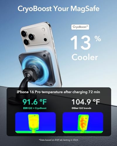 ESR for Qi2 15W MagSafe Car Mount Charger with CryoBoost, Phone Cooling MagSafe Car Charger, Air Vent/Dashboard Wireless Charging for iPhone 17/16/15/14/13/12, S25 Series, Pixel 10, Fast Charger