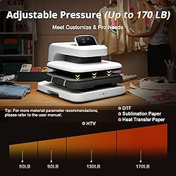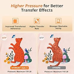 【Pressure Customization】HTVRONT Auto Heat Press 2 can effectively avoid the situation of insufficient pressure. You can adjust the appropriate pressure according to your different heat press needs, and easily adjust the pressure of the heat press machine up to 80 kg(170lb), perfect for DTF projects, no longer need to worry about insufficient pressure. 【Higher Heat Press Height & Widely Used】HTVRONT 15x15 heat press has increased the height for heat pressing. Now, you're ready to go with larger, more varied projects with heights up to 4.5 cm(1.77in). This will mean that you can use our heat press machines not just for heat pressing shirts and simple heat pressing projects, but you can also use it for heat press heavy items such as your hoodies! 【Heat Up Fast & Evenly】Our heat press machine for t shirts combined with NTC thermistor technology and a dual-tube heating engine, which can heat up quickly, saving you up to 30% of waiting time. In addition, our heat press 15x15 distribute the heat evenly, maintaining consistent heating area, ensuring that you have a clean and professional transfer. Heat Press will heat up to 410°F within 5 minutes and 30 seconds, you can wait for the machine to heat up successfully before heat press 【Automatic Heat Press & Hands Free】After setting up the heat press parameters, you only need to press "R" button, HTVRONT heat press will automatically press your design, the machine will buzz when the timer is over to remind you that the press is finished and release the material automatically. In this way, you can work on something else while it’s pressing, greatly improving your work efficiency. 【Angle-Adjustable Screen & Auto-Off Feature】HTVRONT commits to every ergonomic detail for crafters. The screen angle provides 7 levels within the range of 0-75°and supports manual adjustment, making creation more comfortable. Moreover, HTVRONT sublimation heat press takes users' safety with full concern. Our shirt heat press will auto shut up if no operation after 15 minutes. No worries about overheating. 【Small footprint & Great Service】The compact and stylish design of the automatic heat press machine means that it doesn't take up a lot of space. With FCC certificated, htvront heat press machine reaches the required safety standard in the USA. If you have any questions with HTVRONT automatic heat press, please feel free to contact us ASAP. We will try our best to solve your problems and provide you with a joyful experience
