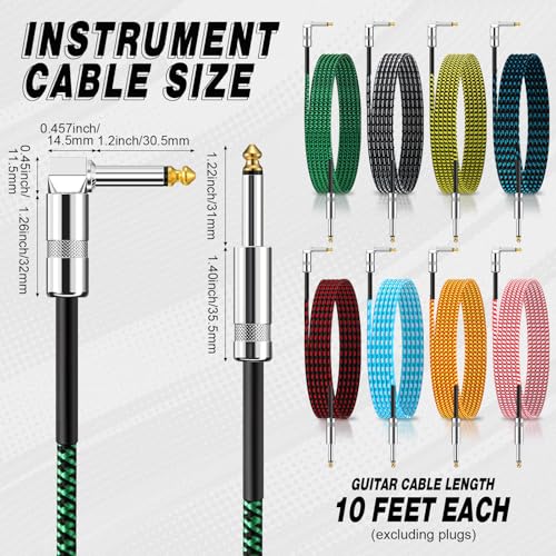 Elevate your music experience with this 8-pack of high-quality guitar instrument cables. Measuring 10 feet in length, these versatile cords are perfect for connecting your electric guitar, bass, keyboard, effects pedals, and microphones. Crafted with durable copper wiring, these electric guitar cable ensure reliable signal transmission and exceptional audio clarity. The multicolored design adds a touch of style to your setup, while the sturdy construction guarantees long-lasting performance. Whether you're jamming at home, rehearsing with your band, or performing live, these guitar cables offer the dependability and convenience you need. Upgrade your gear and enjoy uninterrupted music sessions with this essential accessory pack.