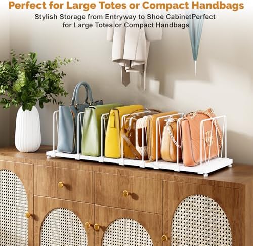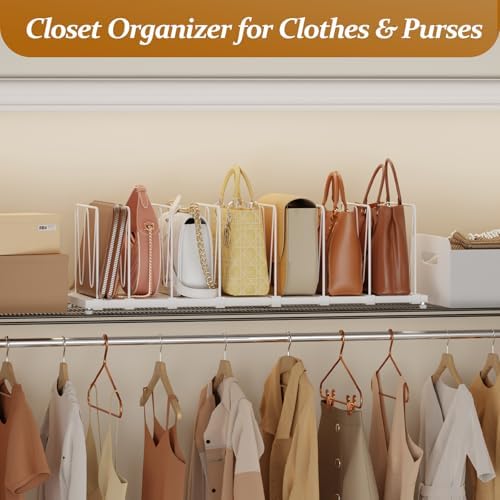 - 【Durable Metal Build】Unlike traditional acrylic handbag organizers for closets, this white iron purse shelf is both sturdy and stylish. Its robust base ensures stability for heavier bags, offering the perfect solution for large purse organizers in any closet organizer setup.