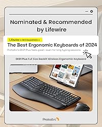 Full-Size Ergonomic Comfort: The ProtoArc Ergonomic Keyboard features a unique curved split-frame design that actively reduces strain on your wrists and forearms and promotes proper posture. The scooped keys are crafted to fit your fingertips perfectly, making typing effortless and natural. Please note: we recommend checking the dimensions before ordering to ensure an ideal fit for your workspace. (While our full-size ergonomic keyboard enhances productivity, it may occupy more desk space) Learning curve: Since it takes some time to adapt to the keyboard layout when you first use our ergonomic keyboard, it may cause inconvenience to your use, We recommend that you take 1-2 weeks to get used to it, but our ergonomic design will help relieve the muscle pressure on your wrists and forearms Adjustable Backlighting: The ergonomic keyboard features soft white LED backlighting with three adjustable brightness levels (Low, Mid, High), allowing you to customize your comfort in any lighting. You can also turn the backlight off entirely to conserve power. This flexibility directly impacts battery life: enjoy up to 12-13 hours in High mode, 18-20 in Medium, 34-36 in Low, and an extended 90-100 days with the backlight off Cushioned Wrist Rest & Adjustable Tilt Feet: Experience comfort with our ergonomic keyboard. The curved wrist rest provides 54% more support to reduce wrist fatigue, ensuring comfortable typing for hours. With four adjustable tilt feet, you can choose the keyboard to three different angles, keeping your wrists relaxed whether you're sitting or standing Note: The keyboard backlight adjusts based on inactivity periods to conserve power: After 1 minute: Backlight turns off (press any key to wake); After 60 minutes: Enters deep sleep mode with backlight disabled (press any key to wake the keyboard within 3 seconds, then manually turn on the backlight) Seamless 3 Device Switching: Switch between devices effortlessly. With Bluetooth and 2.4G USB connectivity, this wireless keyboard can pair with up to three devices simultaneously. A simple key press lets you jump between your laptop, tablet, and computer. It’s compatible with Windows 8/10 or above, Mac OS X 10.12 or above, Android 4.3 or above, and Microsoft systems. (The keyboard cannot be connected via wire) USB-C Fast Charging: The ergo keyboard is equipped with a large 2000mAh rechargeable battery, offering extended working hours—especially with the backlight turned off. Focus on your tasks without worrying about frequent charging.(The USB charging cable can only be used for charging, not for wired connection) Charging Tips: For optimal performance, charge the keyboard using a computer’s USB port or a DC 5V 1A charger. Avoid using fast chargers or high-power adapters, as they may affect the keyboard’s performance. (All keys of the keyboard are not programmable) In 2.4G mode, the keyboard is not compatible with the Mac OS/ IOS system, resulting in some function keys not being able to be used normally. please try switching to Bluetooth mode; By default, F1-F12 are multimedia function keys. it need to press Esc+Fn to turn off to switch to traditional key functions