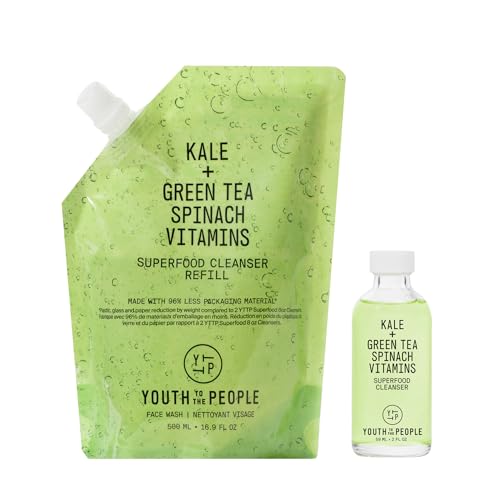 Youth To The People Superfood Cleanser Travel Refill Bundle Set, Kale + Green Tea Face Cleanser (2oz) + (16oz Refill Pouch), Award-Winning Face Wash, Makeup Remover, All Skin Types