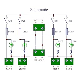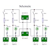 - 1, Operating voltage DC 5 to 32V. Total rated current 52 Amps. Paddle switch. Pluggable side wiring terminal block. 2, Input: Rated current 52 Amps. Dual input screw terminal block, the direction of the input terminal wiring can be flexibly selected, and it can also be extended to other modules as its input source. Pitch 10.16mm/0.4", wire range 20 - 6AWG / 10mm square, strip length 10mm, screw - metric M4. 3, Output: Maximum current 5 Amps for per channel (the factory-installed fuse is 5 amps. If the fuse is replaced, the maximum current can be up to 10 amps). Pluggable terminal block, pitch 5.08mm/0.2", wire range 28 - 12AWG / 2.5mm square, stripping length 7mm, screw - metric M2.5 slotted. 4, Each output terminal is equipped with an independent switch, which can flexibly control the power supply of each load device. 5, Each output terminal is equipped with an independent fuse, which can protect the power supply of each load device and are not affected by each other. Medium blade ATO fuse. The fuse holder supports fuse replacement, making fuse replacement easy. 6, Each output terminal is equipped with a green LED power indicator. The indicator light comes on when power is on and goes off when the switch is off or the fuse fails. 7, High quality fireproof nylon material DIN rail mount carrier, can support width 35mm, 32mm or 15mm rail. A pair of DIN rail to Wall mounting adapter brackets are also included, which will support wall or wood panel mounting. 8, UL CE CQC certified terminal blocks. UL 94-V0 certified PCB, and UL CE certified DIN rail mount carrier. UL certified fuse holder and fuse. UL CE certified switch.