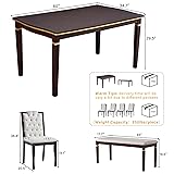 ♬【Elegant Dining Table Set】Enjoy high-end elegance with this 6-person solid wood dining table set that seats 6. The rectangular table top is meticulously turned and finished in gold, exuding sophistication and elegance. With 4 upholstered chairs and a bench, this 6-person dining set is perfect for hosting dinner parties with friends or enjoying everyday meals with family, making it an essential dining set for your home. ♬【Superior Quality】The table top of the 6-person dining set is made of a combination of MDF and mango wood veneer for stability and durability in everyday use, and the legs of the 6-person dining set are made of rubberwood to extend the life of the set. With a weight capacity of 250 lbs. for the table and 250 lbs. for the chairs/benches, the 6-person dining set gives you peace of mind. ♬【Notable Details】The attention to detail in this set of six dining table and chairs is reflected in the soft and comfortable upholstered chairs with beautiful rivet accents on the backs. All four high-back upholstered table and chairs have curved backrests that provide excellent back support for comfort during long gatherings. ♬【EASY ASSEMBLY】The dining set is designed with user convenience in mind, making the assembly process stress-free. We provide all the necessary tools and clear instructions to ensure a smooth installation of the dining table and chairs. ♬【Excellent After-Sales Service】If you have any questions, please feel free to contact us, we will reply you as soon as possible. Dining Table: 60 x 34.7 x 29.5 inches, 61.729LBS.