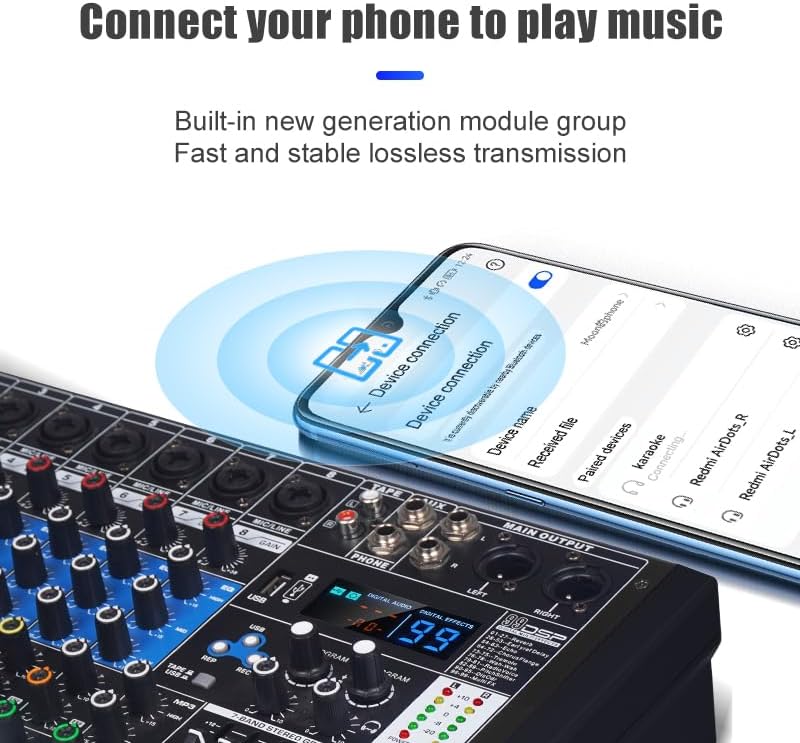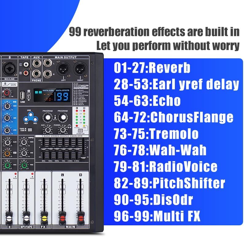 Built-in 99 DSP effects for the mixer. You can switch to the corresponding DSP effect to accommodate more different scenarios, this incredibly versatile mixer is perfect for high quality stage performances, live performances, and parties. You can even add delay or reverb effects to the mix. You can feel free to contact us if you have any questions before you purchase or during use,we will serve you