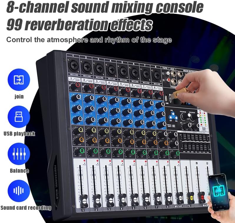 MIX8 Professional 8-Channel Portable Mixer with 99 DSP Digital Effects and Bluetooth Playback, USB Port, Professional Recording & Live Performance DJ Mixer (mix8 Black Foreign Trade)