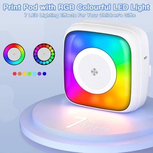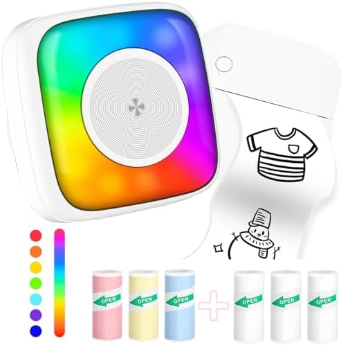 Mini Printer Sticker Printer Print Pod with 6 Rolls Sticker Paper, Seven Color Lighting Modes for DIY Scrapbook, Travel, Notes, Label, Memo, Compatible with iOS&Android