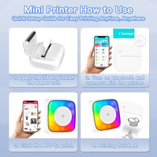 - Multifunctional mini printer: Our mini printer has been fully upgraded. Firstly, it now features seven colors and modes of colored lights to enhance your visual experience while printing. Secondly, it is equipped with a high-quality thermal print head for faster printing speeds. With this thermal mini printer, you can print stickers, storage labels, lists, memos, photos, cartoon characters, and more, achieving clearer and more detailed print results.