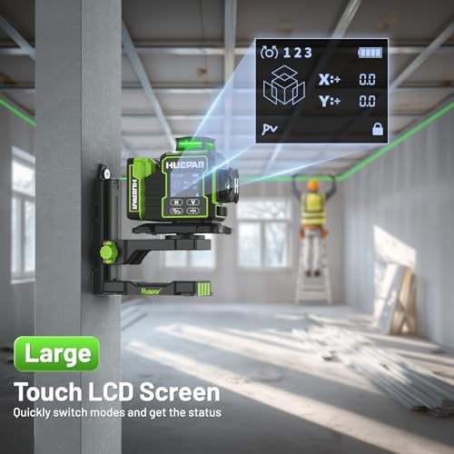 - 【Advanced LCD Touch Panel and Backlit Display】 The large backlit LCD display of the green laser level clearly displays the laser lines in use, the tilt angle, battery power condition, pulse mode, self leveling mode, manual mode, and rotation speed. Contains everything you could possibly want to know about laser levels. The 3D laser level can be easily operated through the touch panel which is highly adaptable, whether you touch it directly with your fingers or touch it behind gloves