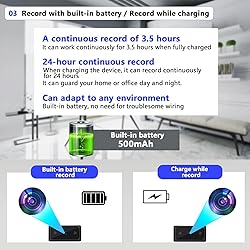 【High-Quality】: Mini, Portable, Small design,and it provides sharp and clear high-quality 1080P HD right. ensures captures are clear. - 【Built-In Battery & Record While Charging】Mini Spy Camera with a built-in 500 mAh rechargeable lithium battery, which can be last for 3.5 hours when fully charged. It also supports working while charging, making it a powerful tool for life. (Via Amazon no audio policy) 【Automatic Night Vision Switching Function】His Hidden mini cameras is equipped with 2 (940nM-no light) high-efficiency infrared night vision lightsThe equipment will automatically activate the night vision function in a dark environment and can still offer a clear picture even in the dark. and is helpful for home and office security measures.measures. 【Smart Motion Detection & Loop Record】In Motion Detection Mode, within the visible range of the lens, the camera will intelligently detect and identify moving people or objects on the screen through the AI algorithm and automatically record the video. It can effectively save the memory card's storage. - Support up to 512G TF card (NOTICE:SD CARD NOT INCLUDED IN THE PACKAGE). 【Latest Gravity Sensor Technology】which means that even if you flip it up and down 180°, the video will always be in an upright orientation.Convenient for you to record videos more conveniently and safely. - 【Time Watermark Setting】it supports video time modification, and can also set watermark display/hide. 【Easy to Use & Safe record】 MINI size Cam - This small camera is a cuboid measuring 0.65*1.14*1.8in. - NO Wi-Fi required and NO Extra Apps needed, it is not easily detected by camera detectors! please feel free to email us with any questions about our products.