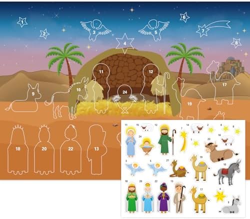 - Kids Nativity Advent Calendar 2024: You will get 1 nativity scene advent calendar and 1 religious jesus stickers for kids. Children love placing the advent stickers on the advent calendar nativity scene and eagerly counting down to Christmas. This religious advent calendar 2024 kids provides daily activities that enhance interaction and engagement, making each day filled with anticipation, helping kids the story of Jesus' birth, fostering their understanding and interest in Christmas.