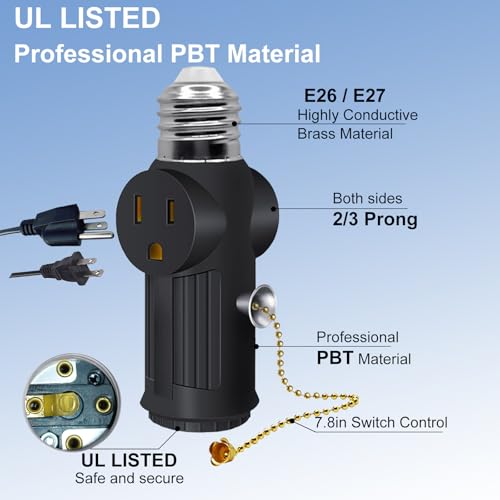 - 【 3 prong Light Socket to Plug Adapter】Our light bulb outlet socket adapter can turn the original E26/E27 bulb socket into two 3 prong sockets. Both sides can support 3 prong or 2 prong at the same time, Equipped with a light bulb control switch, it can control the on/off of the light bulb at any time without affecting the use of sockets on both sides