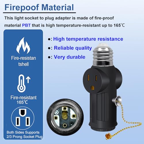 - 【 Safe & Durable】This light socket outlet can withstand high temperature up to 329℉ (165℃) retardant PBT material and high conductive brass,the safety performance has been enhanced,more heat resistant, corrosion resistant and durable, the light socket to plug adapter is FCC listed to ensure your products are supported by the highest standards of safety and performance.