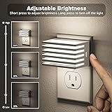 ADJUSTABLE BRIGHTNESS: Our LED night light offers 3 adjustable brightness levels to suit your needs. Short press the button to cycle through low, medium, and high settings, and long press to turn off the nightlight. Perfect for creating the right ambiance in bedrooms, bathrooms, nurseries, and hallways. (The light remembers the last setting when turned off but resets if unplugged.) AUTO ON OFF: Equipped with smart light sensing technology, this plug in night light automatically turns on or off according to ambient brightness, providing convenience and energy efficiency. SLEEK DESIGN: With its modern design, this led nightlight not only provides functional lighting but also adds a stylish touch to any space. Perfect for the living room, kitchen, or bedroom, this plug in night light complements your home decor, adding a charming touch to any space. VERSATILE USE: The compact size and gentle glow make this night light plug into wall perfect for various settings. Whether in bedrooms, bathrooms, living rooms, kitchens, stairways, or hallways, it's an excellent choice. DURABLE & REALIABLE: Built to last, this night light is made from high-quality materials ensuring longevity. It’s a dependable choice for continuous use, offering consistent performance every night.