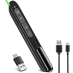【USB AND TYPE C 2 IN 1 PRESENTATION CLICKER】The clicker for powerpoint presentations receiver adopts a unique dual head design, and USB / Type-C easy to use on more devices such as Mac, laptop, and PC, can meet all your needs on different devices. This receiver has a magnetic slot for easy storage and is not easily lost. The presentation clicker adopts a clip design, making it easy to carry, convenient for you to use anytime, anywhere 【MULTI FUNCTIONAL POINTER FOR PRESENTATIONS】Wireless clicker for presentations support functions: full screen/black screen, switch windows, previous/next page, open hyperlink, volume up/down. Presentation remote compatible systems: Windows XP 7/8/10 and above, Mac ISO 3 and above, Linux, Android 4.3 or above compatible. Powerpoint clicker supported software: PowerPoint, Keynote, Prezi, Google Slides, and more 【PLUG AND PLAY&RECHARGEABLE】The powerpoint clicker uses 2.4G wireless RF technology and a plug and play wireless receiver, without the need for software installation or complicated setup. The clicker is equipped with a built-in 350Ah battery and has an intelligent sleep mode. When not in use, it will automatically enter sleep mode to save power. Pressing any key again can wake up the pointer clicker for presentation, and the standby time is more than 30 days 【LONG RANGE GREEN LIGHT WIRELESS PRESENTATION CLICKER】The green light pointer for presentations can easily highlight key areas of the slides. The red light projection distance is up to 656 feet, the 2.4G wireless range is up to 165 feet, and the 360°flexible control allows you to freely and flexibly interact with the audience outside the screen 【WHAT YOU GET & CUSTOMER SERVICE】 1X Powerpoint Clicker with Pointer; 1 X 2-in-1 USB Type C Receiver; 1X USB C Date Cable; 1X User Manual for Wireless Presenter. We are dedicated to providing customers with the best products and services. Please feel free to contact us if any problems