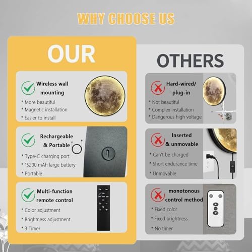 • Realistic Moon Design: Our Dimmable Rechargeable Moon Wall Lamp features an incredibly realistic moon design. With its detailed craters and texture, it brings the beauty of the moon right into your home. It's not just a lamp, but a piece of art that adds a touch of magic to any room.
