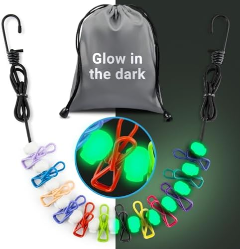 - GLOW-IN-THE-DARK STOPPERS & CLOTHESLINE CLIPS FOR SECURE DRYING: Dry your laundry securely even at night with 13 glow-in-the-dark anti-skid stoppers with this clothes line for outside. Includes 37 sturdy, rust-resistant clothesline clips, gently holding clothes in place without lumping or slipping. Perfect for any clothesline outdoor setup, laundry line retractable usage, or as a clothes drying line, ensuring easy and hassle-free drying regardless of the lighting or weather conditions.