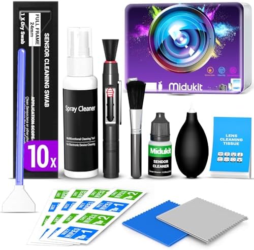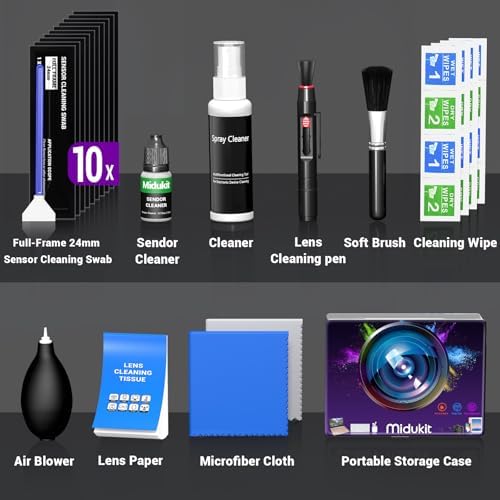 - KIT DE LIMPIEZA COMPLETO PARA CADA FOTÓGRAFO - Nuestro kit de limpieza de cámara viene con todo lo que necesitas: hisopos de limpieza de sensor de marco completo * 10 + limpiador de sensor de 10 ml * 1 + limpiador de lente de cámara 50 ml * 1 + pincel de lente 2 en 1 * 1 + cepillo suave * 1 + soplador de aire * 1 + papel de limpieza para lente * 50 + paño de limpieza de microfibra * 2 + toallitas limpiadoras * 8 + estuche de almacenamiento * 1, Ya sea que uses una cámara DSLR o sin espejo, este kit tiene todo lo que necesitas para mantener tu equipo impecable