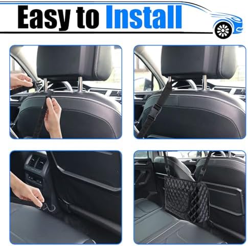 - Easy Installation: First, open the armrest compartment cover and place the adhesive sticker on it. Then, hook the two buckles on the headrest bars on both sides of the front seats. Finally, hook the bottom hook under the seat. Handbag organizer pocket uses unbreakable elastic straps to hold heavier items