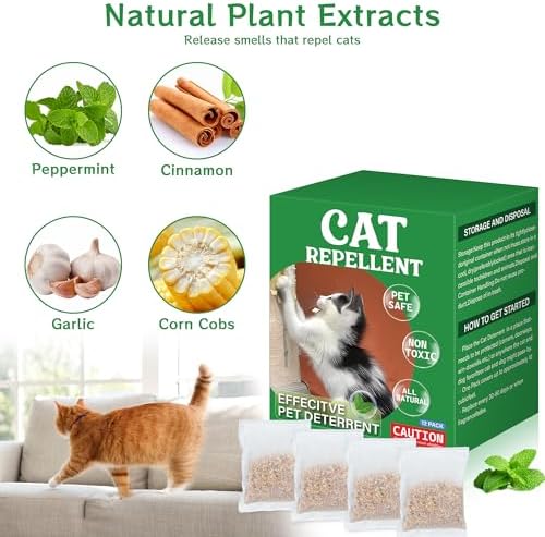 - 12 Pack Mint Cat Repellent: The mint cat repellent bag releases an odor that cats dislike, protecting your furniture, carpets, and curtains from scratching. It guides cats away from specific areas or items
