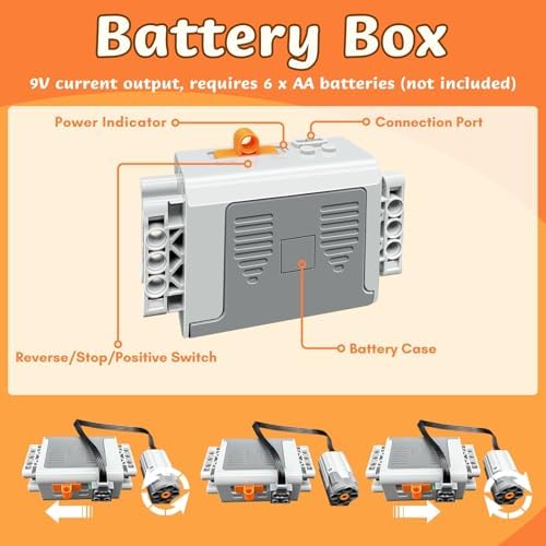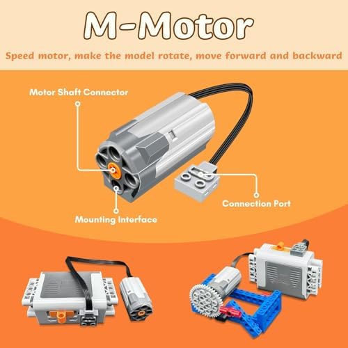 - 6PCS P𝗼𝘄𝗲𝗿 F𝘂𝗻𝗰𝘁𝗶𝗼𝗻𝘀 M𝗼𝘁𝗼𝗿 S𝗲𝘁 — The set includes 2 * M-Motor, 1 * battery box (batteries not included), 1 * 9.84" extension wire, 1 * remote control, 1 * receiver and accessories. These basic pieces could give great functions and features to your motorized models.