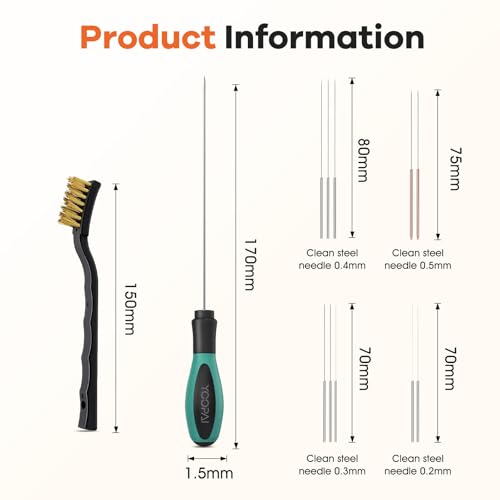 - 【Packaging Includes】: 1x nozzle cleaning needle with handle, 10 stainless steel nozzle cleaning needles with a storage box, and 1x copper wire cleaning brush. This kit is designed to help you easily solve all nozzle and extruder blockage issues.