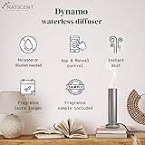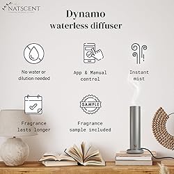 Surround your home with fragrance: Enjoy this bundle of two! The Dynamo aroma diffuser and your favorite four oz bottle of Santal diffuser oil that plugs directly into your diffuser for a Plug & Play experience; Sandalwood essential oils, cedarwood essential oil, green cardamom essential oil, and amber essential oil are intertwined to create our Santal that has been inspired by the Le Labo santal 33 Efficient cold-air diffuser: This effective essential oil diffuser for large room does not need water to work, and it provides minimum consumption of fragrance and consistent coverage of up to 1000 sq. ft. without being overwhelming Fragrances last longer: This home fragrance machine provides the full benefits of your favorite essential oils, maximizing the life & keeping the strength of the aroma oil in the bottle steady; At the highest intensity possible, this Santal diffuser oil will last for at least 1 month Family-friendly comfort: By using nano atomization tech, the Dynamo oil diffuser will spear everyone's nose and senses from bother because it breaks your favorite essential oil blends into tiny particles that are too small to trigger discomfort App & Manual control: With a convenient 24/7 timer and 9 cycle schedules, the Dynamo aromatherapy diffuser can be used manually with the buttons on the base or with the Natscent app via Bluetooth connection
